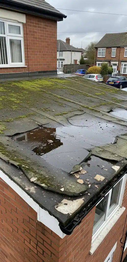 Common signs include water pooling, visible cracks or splits, bubbling, leaks, or damp patches inside the property. Early repairs can prevent more extensive structural damage.